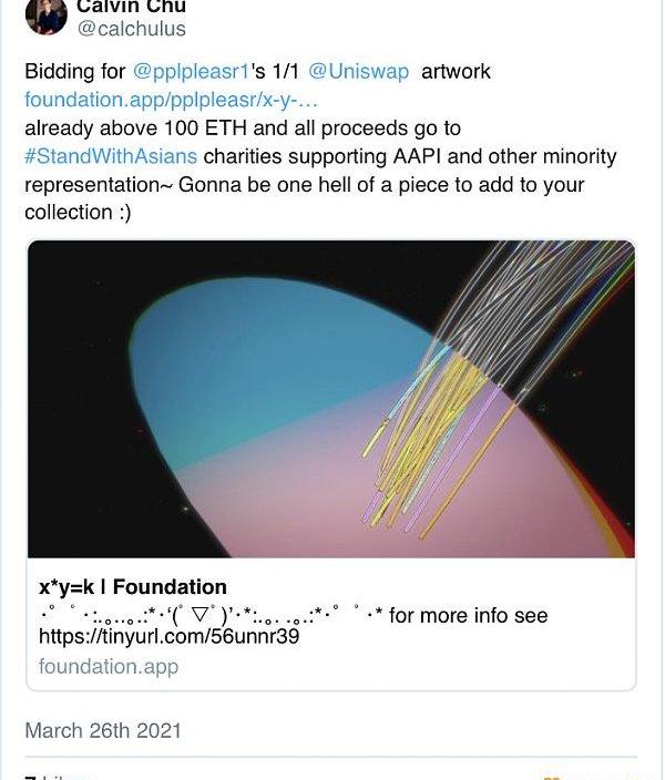 为了庆祝Uniswap?V3版本的到来,数字艺术家Pplpleasr制作了名为x*y=k的作品,该作品目前报价为100ETH!拍卖收入将捐给帮助亚裔美国人、太平洋岛民以及其他群体的慈善机构。