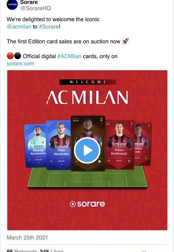 AC米兰足球俱乐部加入新型梦幻足球游戏Sorare。