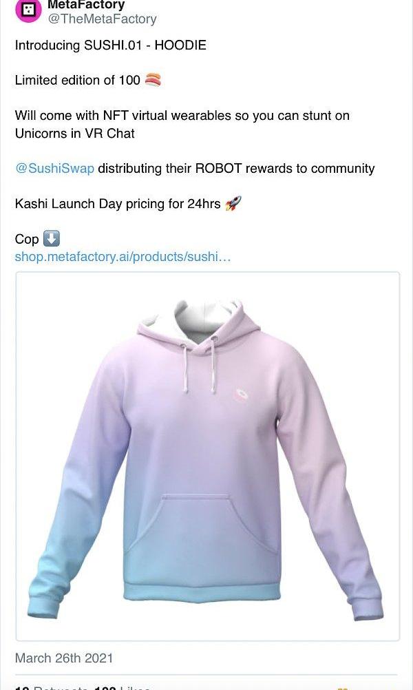 去中心化虚拟现实时尚品牌MetaFactory与SushiSwap?合作推出了限量版系列帽衫SUSHI.01。