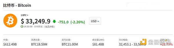自从突破2万美元以来,比特币的价格屡创新高,甚至一度报34700美元/枚。截至发稿, 比特币报33249.9美元/枚,跌2.26%。
