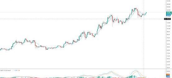大方向趋势未变,依旧多头,长线就耐心持有,短期日线金叉趋势,目前还是蓄势的阶段,后续有望继续反弹,近期压力150美金。