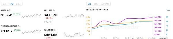 通过观察7天内与顶级市场dapp交互的独立的活跃钱包状况,可以发现Rarible在用户活跃方面领先于OpenSea,7天内用户活跃超过1.5万UAW,而OpenSea只有1万。有趣的是,2月24日,OpenSea宣布他们将推出独家的NFT活动,这导致用户数出现暂时激增,但仍不足以超过Rarible。