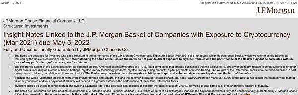 根据提交给美国证券交易委员会的新文件,摩根大通设计了一种新的债务工具,使投资者可以直接投资一篮子以加密货币为重点的公司。
