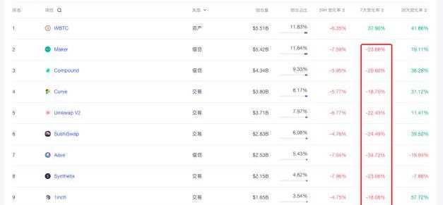 TVL排在前十名的项目,除了WBTC这一锚定BTC的合成资产之外,7日内全部遭遇了资金流失,多数项目的TVL缩水了20%以上。
