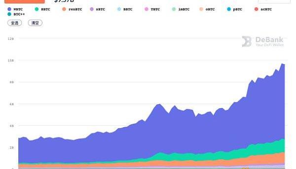 除此之外,DeFi大爆发对比特币牛市也功不可没。据DeBank统计,目前BTC锚定币总发行量约为17.2万枚,总锁仓量超过95亿美元。这个数据其实不亚于已知机构的比特币持仓量。
