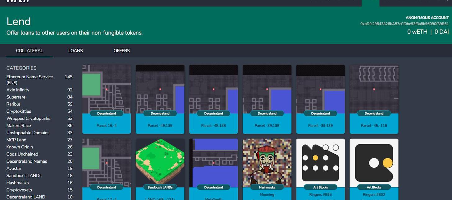 如果这听起来像是你感兴趣的NFTxDeFi混合模式,你可以导航到NFTfi的借贷仪表板,连接你的浏览器钱包,然后根据你的喜好对列出的任何NFT抵押品请求提供贷款。
