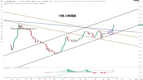前期提示,突破19年顶点回落的周线下降趋势通道后,后续震荡走强的概率大些,操作上逢低布局为主,今日在利好消息的刺激下,迎来大幅拉升,从通道突破点到目前,区间涨幅高达85%,走势相当强势。大方向看,从前期2018年10月开始到目前的时间里,整体依然运行在一个大的上升通道里,周线MACD金叉发散向上,成交量维持较好,整体走势健康,并且目前价格已突破18年顶点与19年顶点连线的下降趋势压制,结束了长期以来的弱势局面,在目前市场整体回暖的形势下,中长线有望突破18年最高,再创历史新高,操作上还是逢低布局为主。