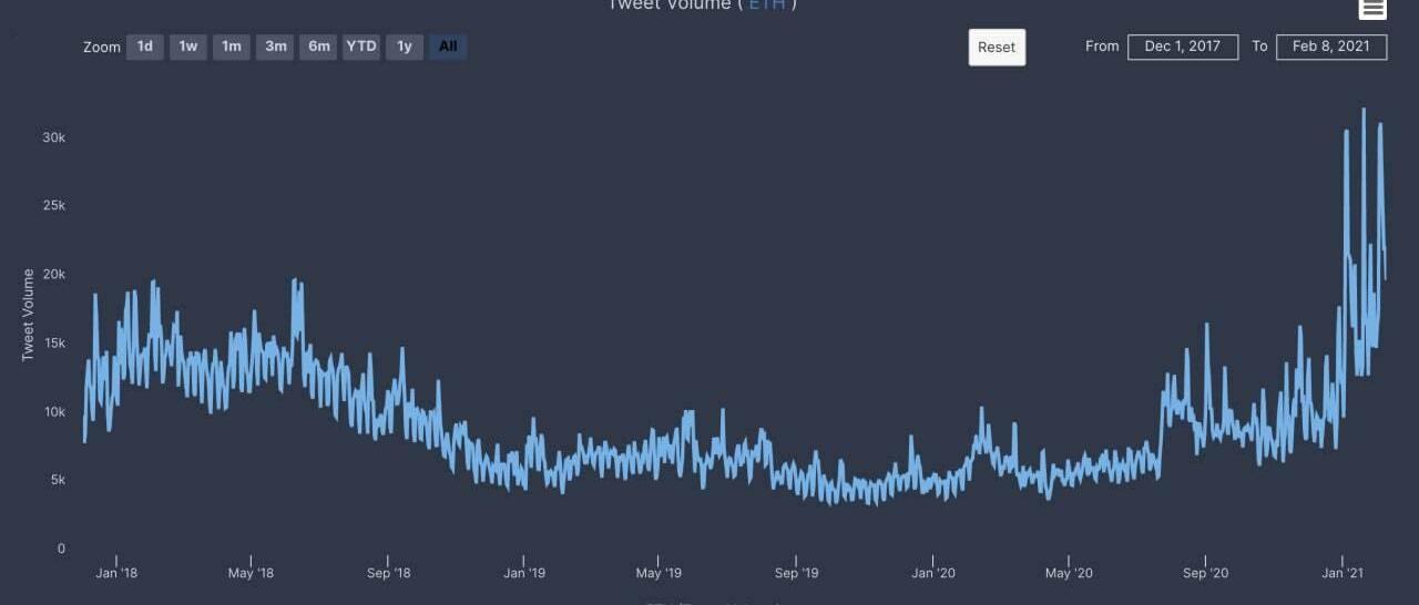 马斯克的推文似乎将加密货币推特的注意力从芝加哥商品交易所(CME)2月8日备受期待的以太期货合约的推出上转移开了。Frank指出,以太坊的推文量在最近创下新高后下跌了一半: