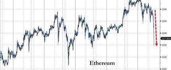 其余加密货币也跌势不止,以太坊跌近10%,下破1160美元/枚。
