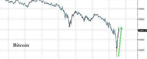 截止11日凌晨4:30,比特币日内狂跌近6000美元,最低至34322美元/枚。随后数分钟内,比特币又短线拉升逾1500美元,截止发稿回升至38000美元/枚附近,日跌幅收窄至5.5%。