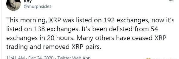 有推特网友统计,早上XRP还在192家交易所上市,目前仅有138家交易所。在20小时内,有54家交易所下架XRP。