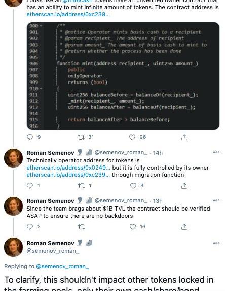 不过,以太坊开发人员RomanSemenov发推指出,看起来所有的MITHCash代币都有一个未经验证的所有者合约,该合约可以铸造无限数量的代币。从技术上讲,代币的操作员地址是0x024976ed0e0e166f5f9f7e696f456798441352fe,但它完全由其所有者合约通过迁移功能控制。既然该项目吹嘘其10亿美元的总锁仓价值,应该尽快去验证合约,以确保没有后门。需要澄清的是,这不应该影响其他锁定在耕作池中的代币,只影响他们自己的现金/股票/债券代币。