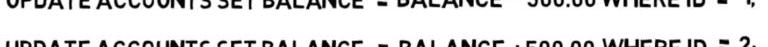 爱丽丝账户的余额是1000美元,鲍勃的余额是500美元。爱丽丝给鲍勃发了500美元。在这种情况下,我们要从Alice的余额中减去500美元,并在Bob的余额中增加500美元。数据库更新报表应这样写: