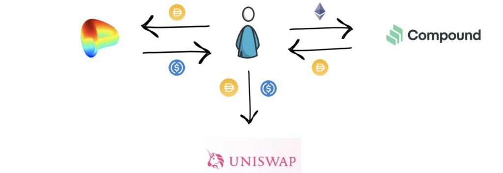 让我们想象一下,Uniswap和Curve之间的DAI/USDC池存在价格差异。你可以在Curve上用1个DAI换取1个USDC,但在Uniswap上您只需要0.99个DAI就可以买到1个USDC。现在你可以尝试执行以下套利: