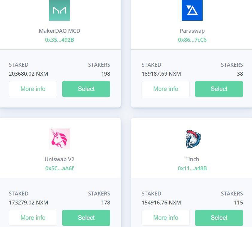 你可以在Staking页面找到所有支持投保的项目,StakingNXM少的项目能够投保的额度非常小,甚至只有个位数ETH。