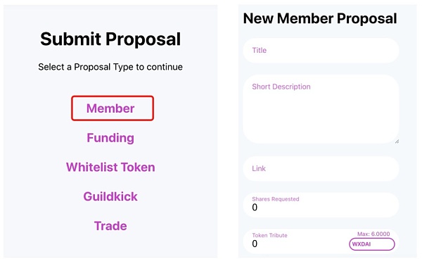 1、通过Daohaus申请加入一个DAO,你只需要提交提案,提供一些关于你的信息,以便其他DAO成员了解你。其次确认你打算出多少Tribute(也可理解为质押多少Token)来换取多少Share(Share类似公司股权,代表了你在该DAO的权益,包括投票权、收益权等。通常一个share代表一个投票权重)。