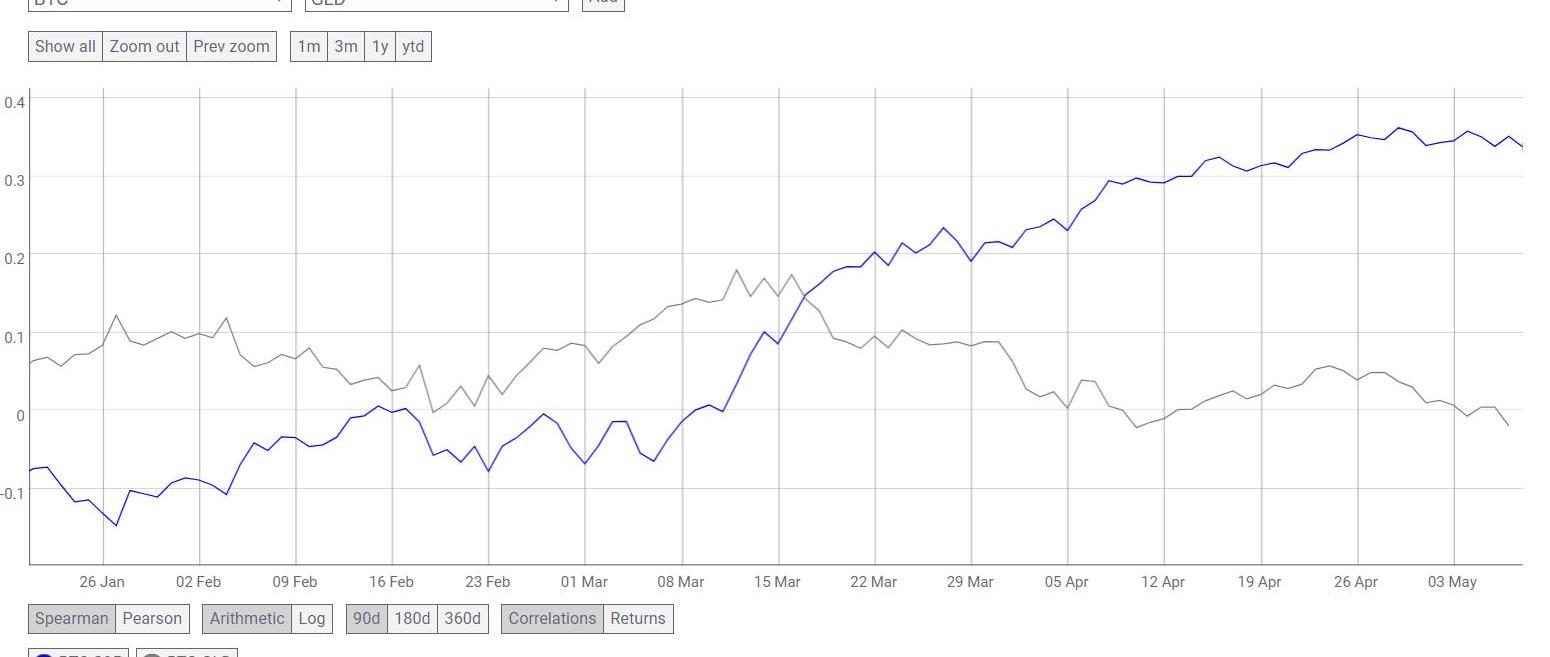 BTC与标普近期仍维持较高的关联性,与黄金走势毫无关联。