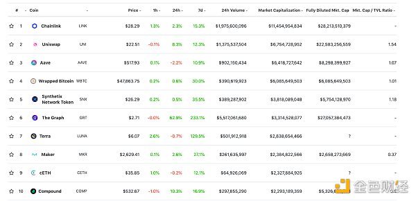 市值前十币种涨跌幅,金色财经制图,数据来源Coingecko