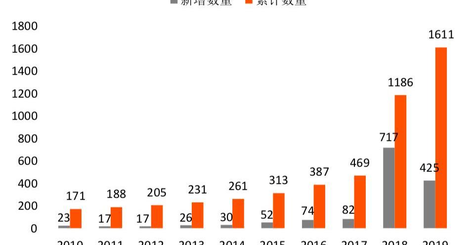 从区块链企业的发展情况来看,杭州市2010-2019年间区块链企业的注册数量始终呈上升趋势,尤其是2018年,该市新增的区块链企业注册数量达到717家,增长率为153%。截止2019年12月,在杭州市注册的区块链企业总量为1611家,相较于2010年增长了1440家,区块链近几年在杭州发展的活跃程度由此可见一斑。