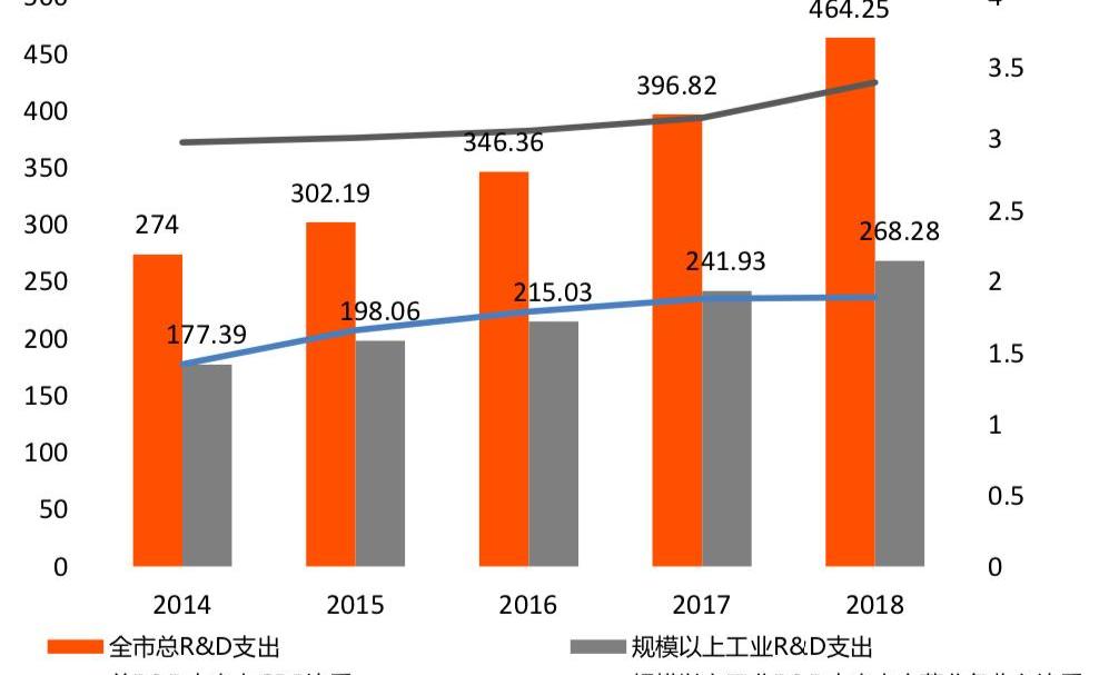 统计数据显示,杭州2018年财政科技支出118亿元,同比增长28%。2014-2018年间,杭州市全市的研发经费支出也持续增加,2018年已达到464.25亿元,相较于2014年的274亿元增长了69%,研发支出在全市GDP中的占比也由2014年的2.98%增长到2018年的3.4%。