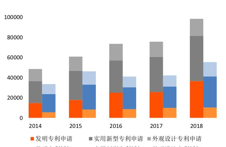 杭州活跃的经济及技术发展也为该城市带来了比较多的专利成果。数据显示,2014-2018年杭州市的专利申请量和授权量都有了大幅度的增长,截止2018年,全市的专利申请数量达到98396件,比2014年增长了103%,相较于2017年增长了30%;2018年专利授权量为55379件,同比增长了31%。就专利类型来看,实用新型专利的申请数量和授权数量都相对较高,其占比在2018年分别达到46%和56%。