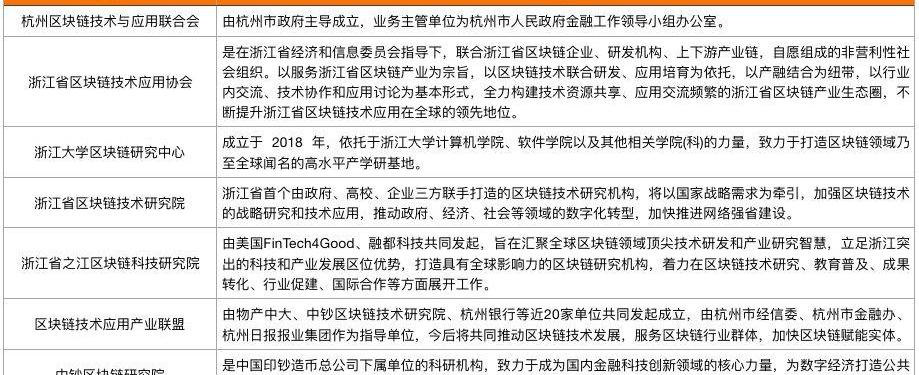 在区块链技术的探索研究方面,杭州市一直走在全国城市的前列,整个城市的经济创新能力异常活跃,由政府、企业以及高校主导成立的区块链组织或研究机构纷纷成立,依托发达的经济环境和技术基础,这些研究机构致力于区块链技术的底层架构、产业应用以及战略发展布局等方面的深入研究,进一步推动了本市数字化经济的发展进程。