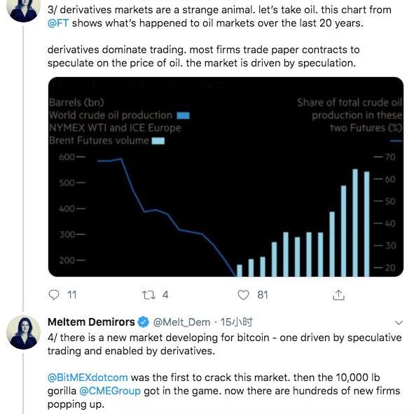 3/衍生品市场是一种奇怪的动物。让我们以石油为例?@FT的这张图表显示过去20年间的石油市场。衍生品主导交易。大多数公司交易纸质合同进行石油价格的投机交易。市场由投机活动驱动。