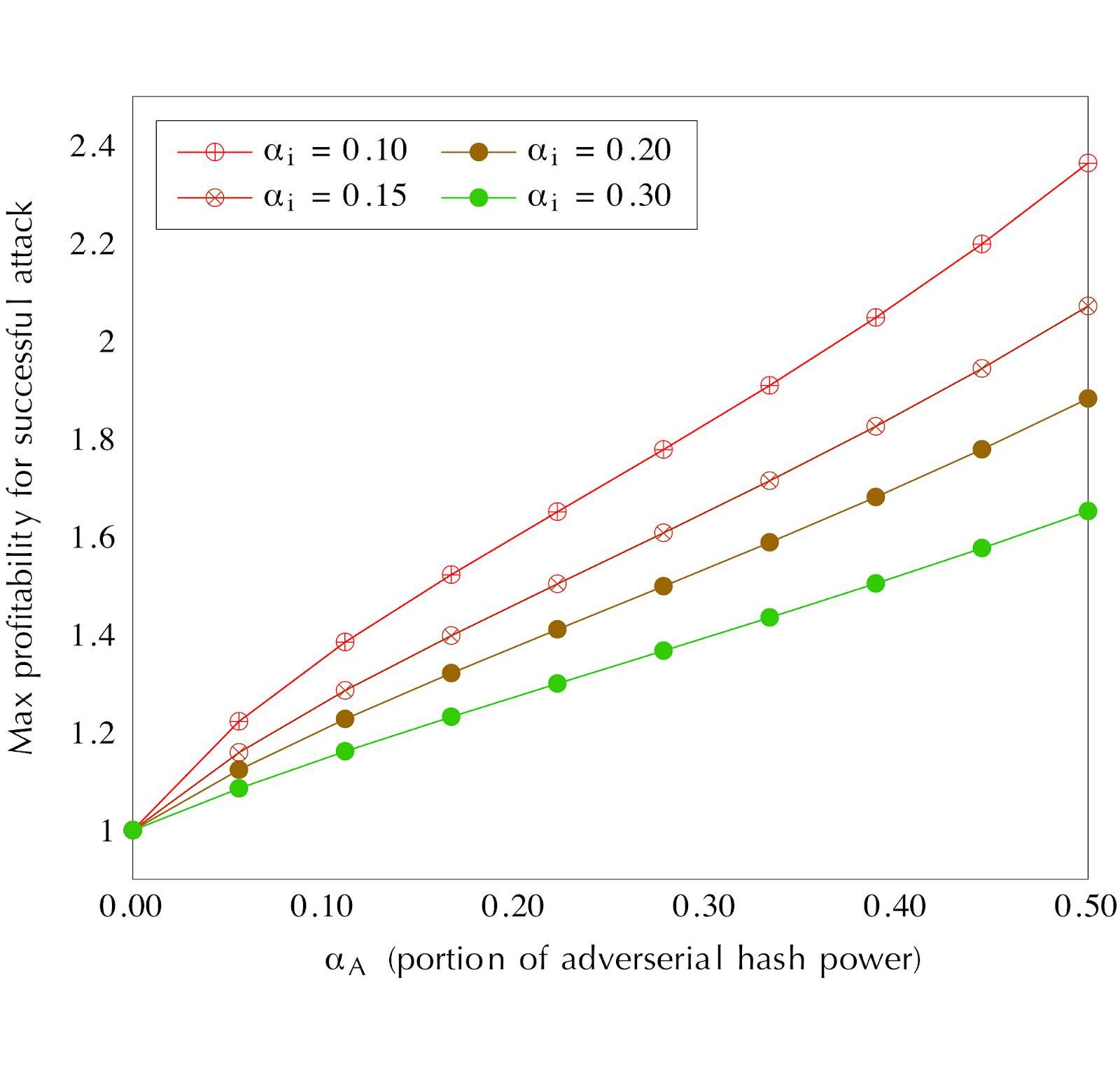 下面的图片显示,对于不同攻击者大小和矿工大小的成功攻击的最大收益率。