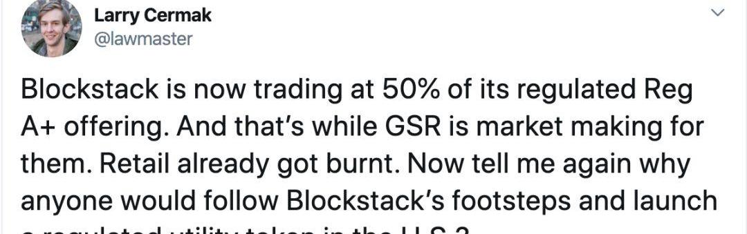 Blockstack现在的交易价格是RegA+时候的一半。这还是在GSRMarket在帮他们做市后的价格。散户已经遍体鳞伤了。请告诉我,为什么还有人跟随Blockstack的脚步,在美国发行受监管的实用性代币?