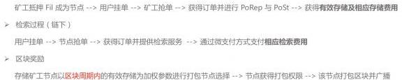 与上图中展示不同的是,Filecoin初期版本中,在存储市场与检索市场中并未实现订单撮合机制,而是采用了抢单机制。Filecoin三大部分相对应的有三个过程,分别是存储过程、检索过程以及区块打包与奖励过程,其简化过程与矿工收益如下图所示: