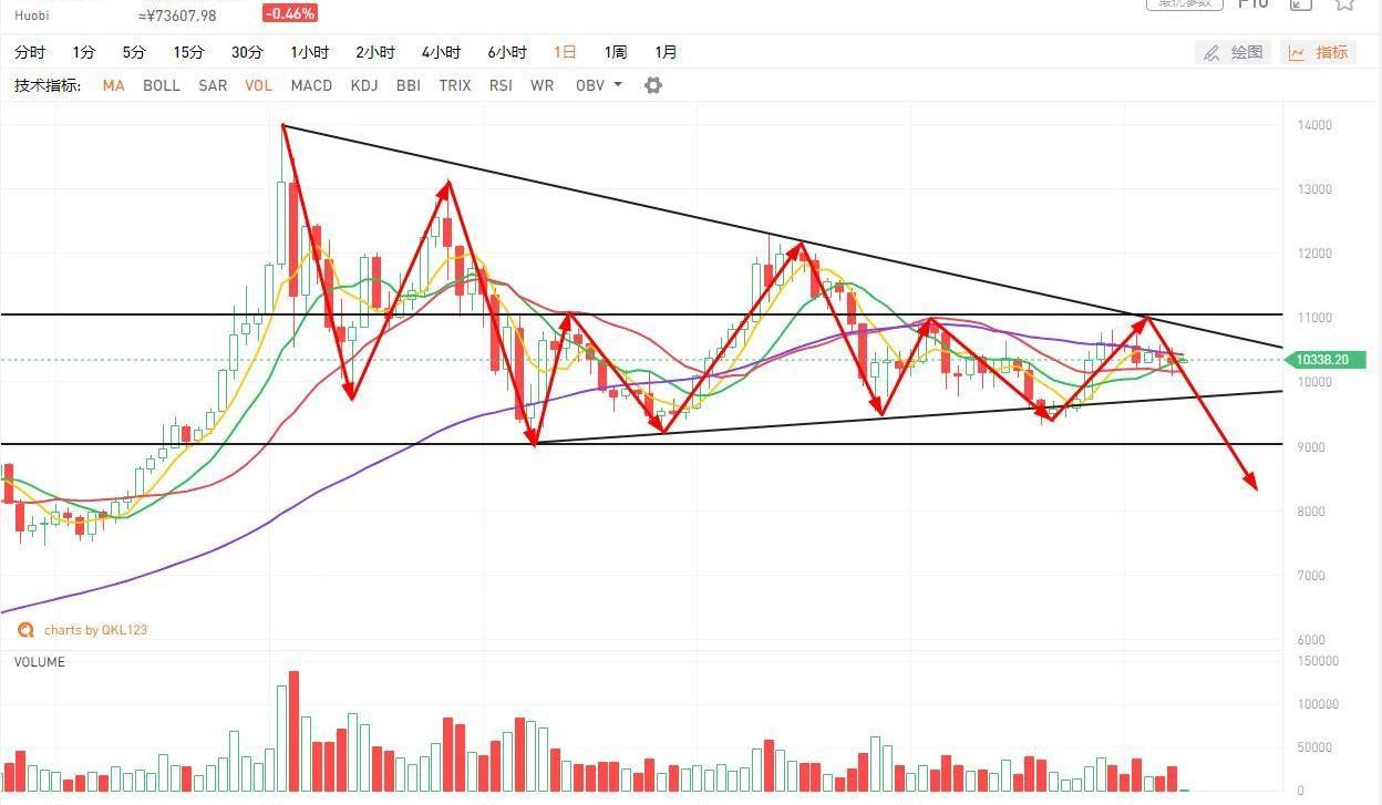 BTC高点逐渐下移,并且在下移的过程中时不时的放出一点成交量,该标的受压于60天线,还是那句话,本轮反弹的主力不是该标的,最多就是他们休息的时候,该标的稍微向上顶一下,不会有趋势性的机会,因为现在该标的中期指标还是向下的,随时可能会进行方向的选择,前面我们也提到过了11000美元的压力位属于密集成交区,要顺利突破必须放出倍量,注意观察,这里如果出现放量的中阳线,则代表该标的将会寻求向上突破的契机,否则可能会诱多该标的再度下破10000美元将会重新展开调整,下一目标位在7200-7500美元附近。