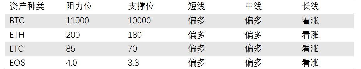 BTC长期趋势向好,目前处于局部调整阶段,疯牛行情可能在未来一至两年到来,可逢低加仓。智能合约平台ETH、山寨币龙头LTC、DPoS龙头EOS的BTC交易对处于年内低位,可逢低配置。
