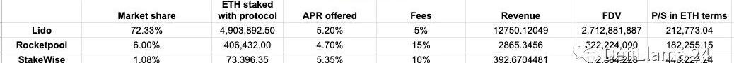 上表是目前排名前4的LSD协议的市盈率。Frax由于其高FDV而表现最差。但是,应该注意的是,Frax不仅提供LSD服务,而且还拥有其他产品,稳定币发行量为$1.51B。Frax是唯一一个与原生代币具有收益分享模型的协议,其中veFXS持有者有权获得8%的抵押收益。随着frxETH在短短4个月内获得1.62%的市场份额的惊人增长来看,很明显,只要frxETH的收益率高于其竞争对手,它就会继续增长。