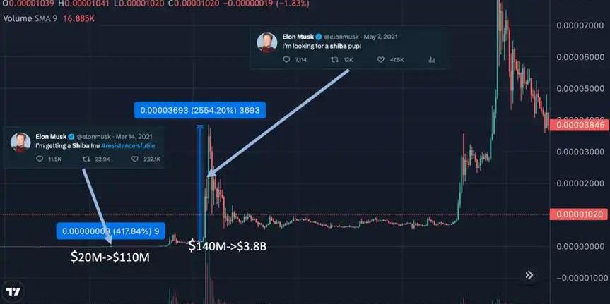 2021年的meme热潮中,ElonMusk可谓头号功臣,他曾在推特喊单带飞DOGE,SHIB,FLOKI等一众MEME币,每次提及便引发币价不同程度上涨,创造了DOGE400倍,SHIB10万倍,Floki几万倍的造富神话。