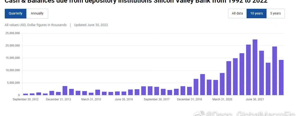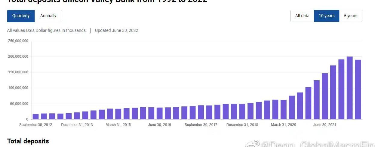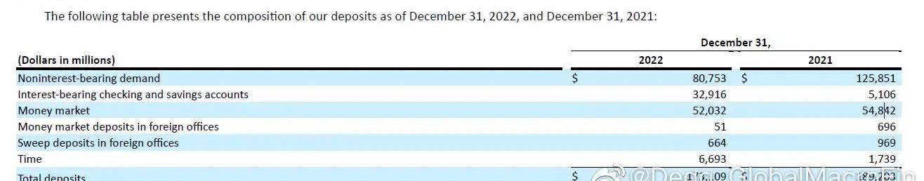 这些未实现损失只要你不卖,就不会成为损失,因此往往被视作「浮亏不是亏」。问题是,2022年美联储快速加息导致全球科技初创企业的日子都不好过,融资融不到,股价一直跌,但研发还得继续,就只能持续消耗它们在SVB的存款。再叠加美联储缩表等因素,SVB的存款自2022年3月触顶后就一直流出。2022年全年存款总额下降了160亿,大约占存款总额的10%,特别是活期无息存款由1260亿骤降至810亿,大大增加了负债端的利息支出压力。