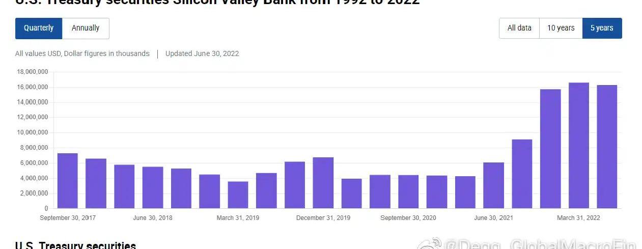 2020年下半年疫情担忧褪去后而美联储仍在承诺维持0利率很长时间,量化宽松持续进行,通胀也见不到影子,全球迎来了科技企业的融资热潮期,startups贷款和风投额度的快速增长使科技初创企业手里积累的大量的现金和存款,而这些存款很大程度流入了SiliconValleyBank这一硅谷最重要的、也是全美前20大的银行。2020年6月至2021年12月的一年半期间,SVB的存款由760亿美元上升到超过1900亿美元,增幅接近2倍。