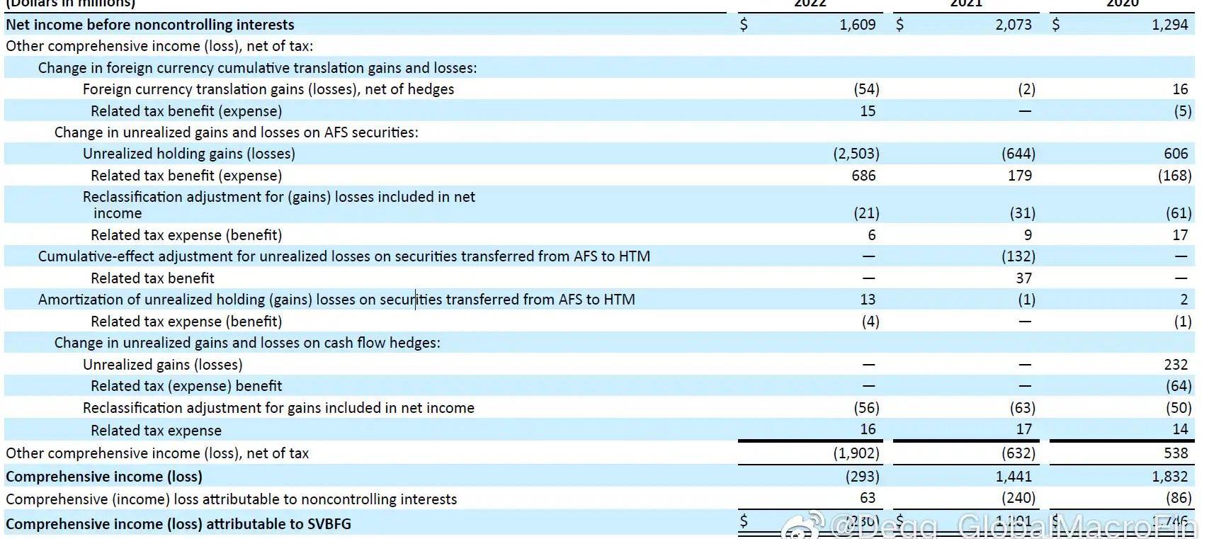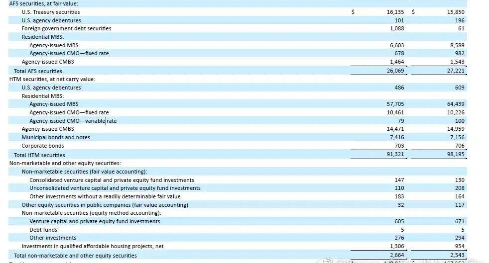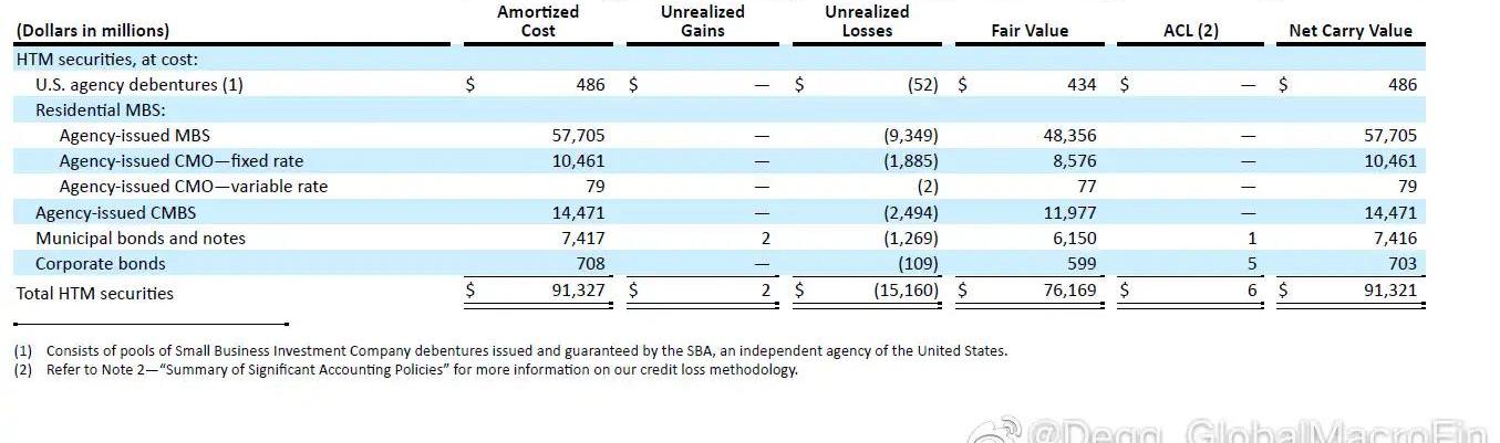 我们知道商业银行买固收产品大多是以可供出售和持有至到期来做会计处理的。SVB也不例外。其160亿的美债完全以AFS计量,而1000亿的MBS主要是以HTM来计量。AFS和HTM的好处是,资产市值的波动不会直接反映在损益上,至多影响其他综合收益下的未实现损益,而且可以转回。但缺点是,一旦被迫出售AFS和HTM,就需要在当期确认一笔损益。