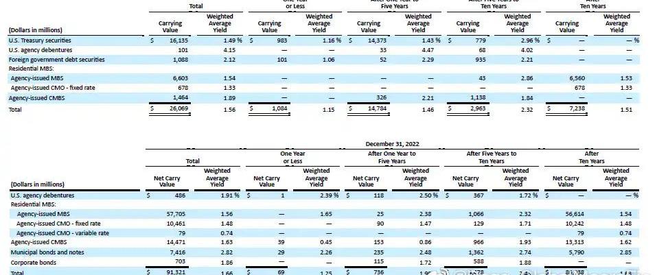 由于SVB的资产购买集中在2020-2021年低息期间,因此AFS和HTM资产的平均收益率非常低。从10-K看,其AFS的平均收益率只有1.49%,HTM的平均收益率只有1.91%。伴随美联储2022年的快速加息,这些低息时期购买的AFS资产在2022年给SVB带来了超过25亿美元的未实现损失,而如果将1000亿以HTM计量的MBS的未实现损失考虑进去,总的未实现损失高达175亿美元。