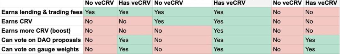 下图总结了Curve体系中,持有CRV和veCRV的不同权利和激励: