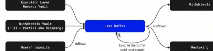 几类Lido相关的ETH都可以被用来帮助实现快速提款1.用户存在Lido合约中,等待被质押到验证节点的ETH2.执行层每天所获得的MEV奖励和交易费奖励3.Lido验证节点每天收到的部分质押奖励