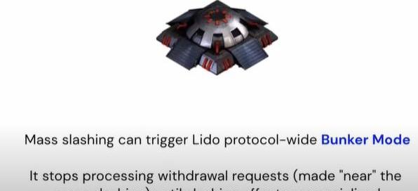 Slashing惩罚是不可预测并且可能需要长达36天等待。对于大规模的Slashing消减,Lido会引入一种bunker模式。如果处于这种模式,提款请求会被暂停。直到消减的数额被所有质押者共同分担后,才会重新开发提款。Bunker模式是为了以防万一,至少当前Lido相关的节点是0消减