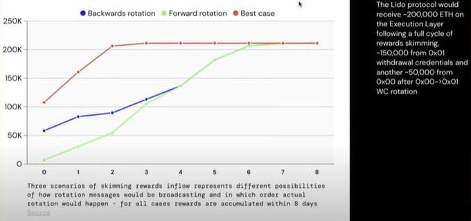 Lido在第一个节点提款遍历周期里,会大约有20万个ETH因为部分提款转移到执行层的提款地址。这一部分会立即处于可用状态。而这一部分可以用来帮助质押者快速的从Lido进行提款,而且也能帮助stETH/ETH汇率接近1。