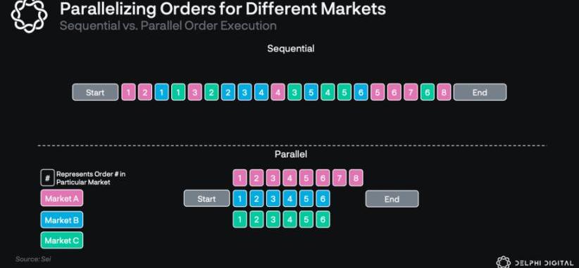 ?对区块生产过程的第三个优化是围绕交易执行的。使用ABCI的Cosmos链的交易处理是按照先后顺序执行的,该过程中,不管在哪个市场中交易都是挨个儿进行处理,这大大阻碍了吞吐量。并且随着负载增加,延迟也将成倍增加。使用并行处理,不重叠的独立市场可以同时处理。与其在市场A的交易后再处理市场B的第一笔交易,不如同时处理它们。特定市场内的交易仍然需要按顺序处理,以避免不确定性,当两个不同的验证器对同一状态得到不同的结果时,就会发生不确定性。?