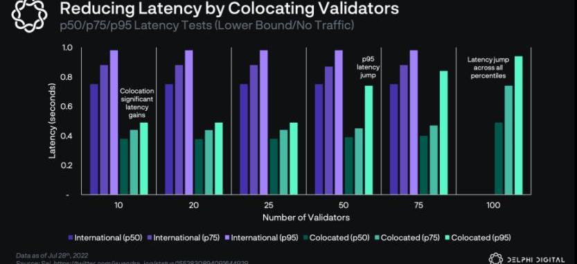 为什么要进行主机托管?如果验证器在地理位置上分散,信息的传输就需要更长的时间,也就导致在达成共识和产生区块时会有更高的延迟。订单簿交易平台需要尽可能地减少延迟。Sei再次公布了他们围绕主机托管的一些测试结果: