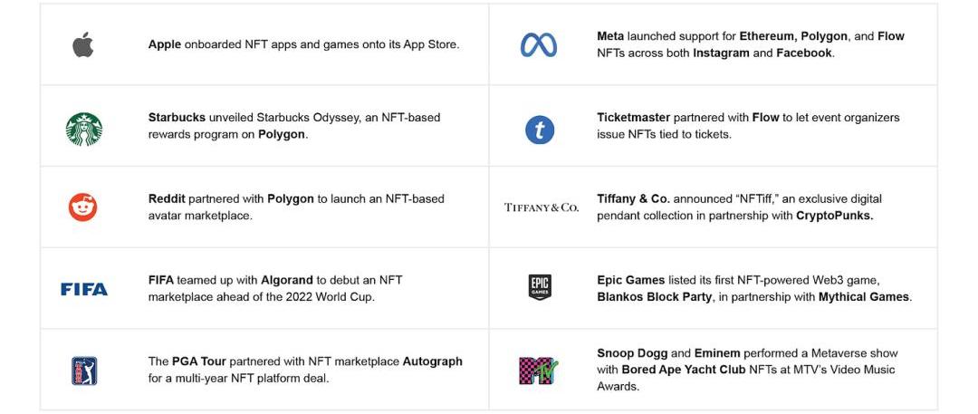 新的投融资交易表明NFT的使用发生了演变——从数字艺术和收藏品到游戏、元宇宙应用程序以及更多以实用为中心的应用程序。第三季度NFT行业的另一个主要增长领域:大品牌、体育和媒体公司宣布建立新的合作伙伴关系,以启动NFT战略。