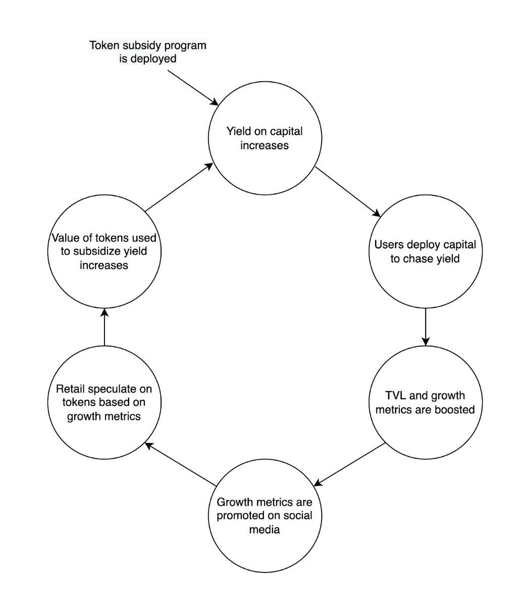在牛市期间,散户会猜测任何变动,用于补贴奖励的代币将不可避免地具有高于零的价值,即使在第一天也是如此,这足以启动随后的良性循环。确保给补贴计划起一个吸引人的名字,并专注于该计划将如何促进增长以及您的生态系统正在增长并且增长良好。欢迎来到印钞的世界。