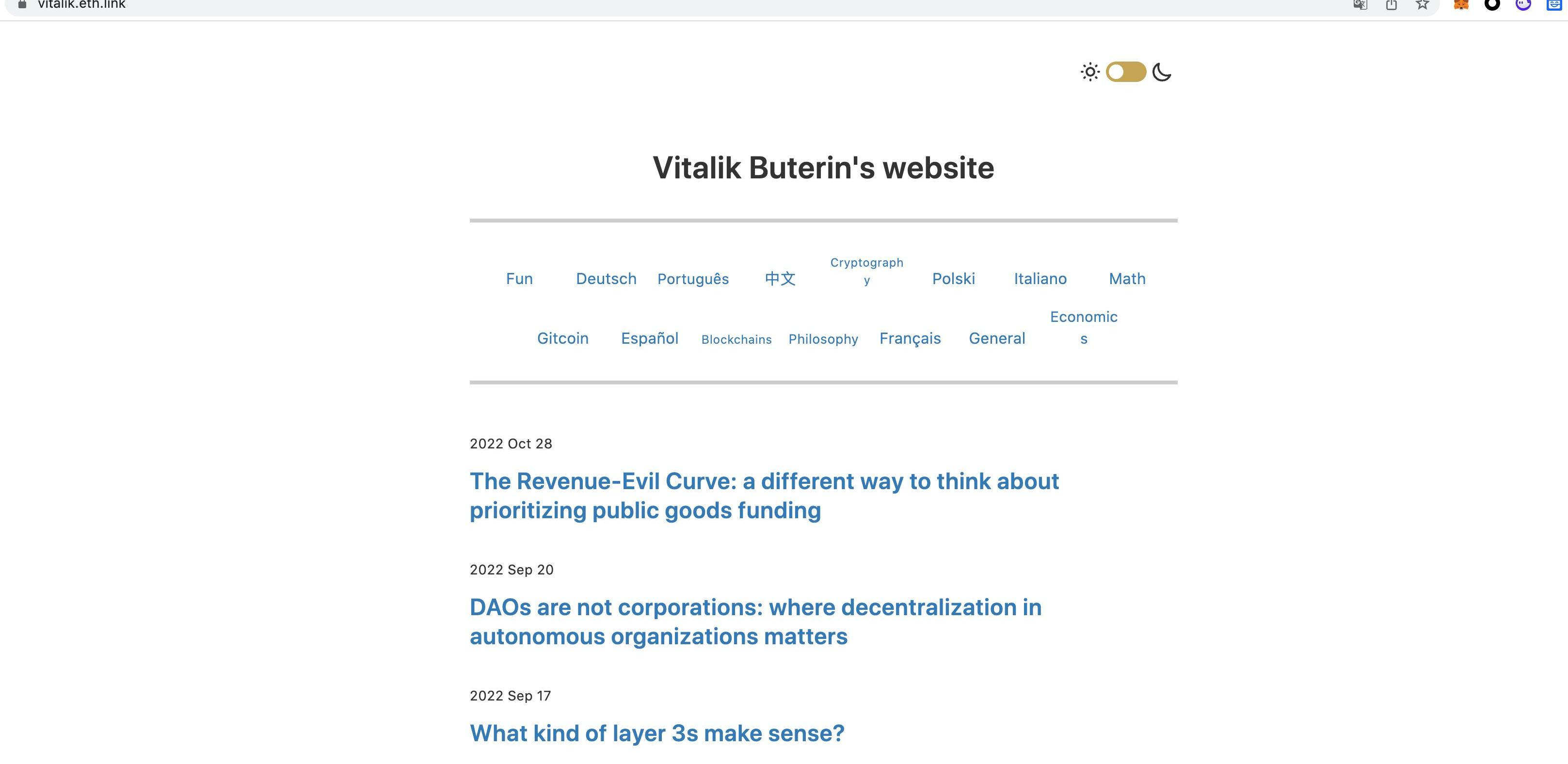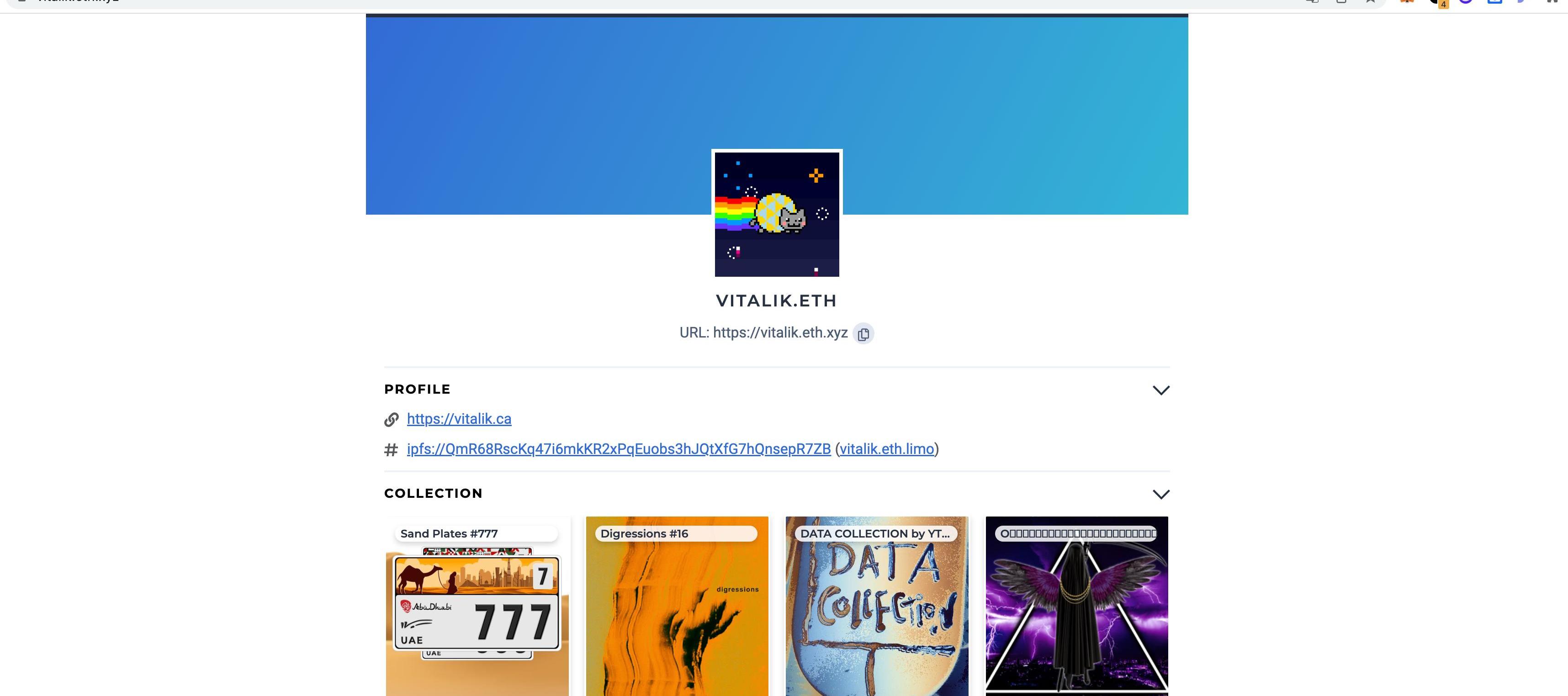 虽然“vitalik.eth”不能够直接被输入浏览器中被解析,但诸如“vitalik.eth.xyz”“vitalik.eth.link”就可以。读者不妨也试一试,比如往浏览器中输入“vitalik.eth.xyz”,就可以看到Vitalik默认生成的ENSProfile;输入“vitalik.eth.link”,就可以看到Vitalik的个人主页: