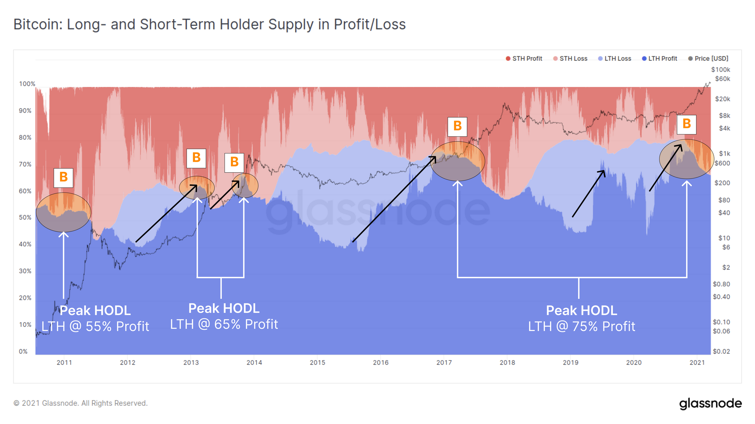 2013年HODL峰值 = 供应量的65%(出现了2次)