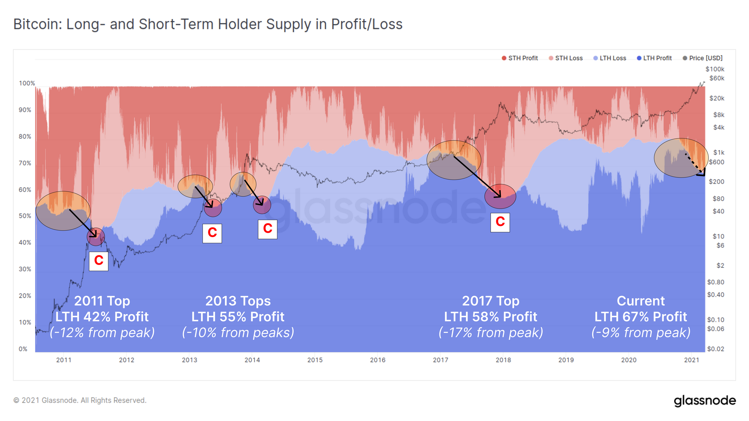 我们还可以看看长期持币者(LTH,蓝色),短期持币者(STH,红色)拥有的供应量的相对比例,并根据币最后一次移动的时间,将其分类为盈利(深色)或亏损(浅色)。请注意,以下图表显示的是处于损益中的流通供应的比例,而不是PnL的大小。