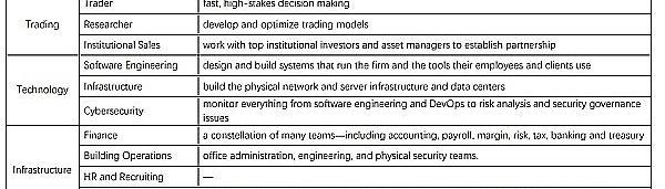 作为传统领域头部量化机构,JaneStreet岗位设置清晰明确,由Trading、Technology和Infrastructure3各业务板块构成;